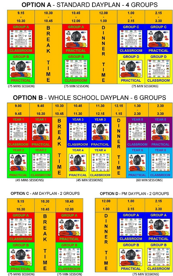 Please note: There is always two groups working during each time slot. One group would be in the classroom whilst the others works simultaneously doing a practical football session. They would then swap round for the second time slot, so both groups do each of the activities.